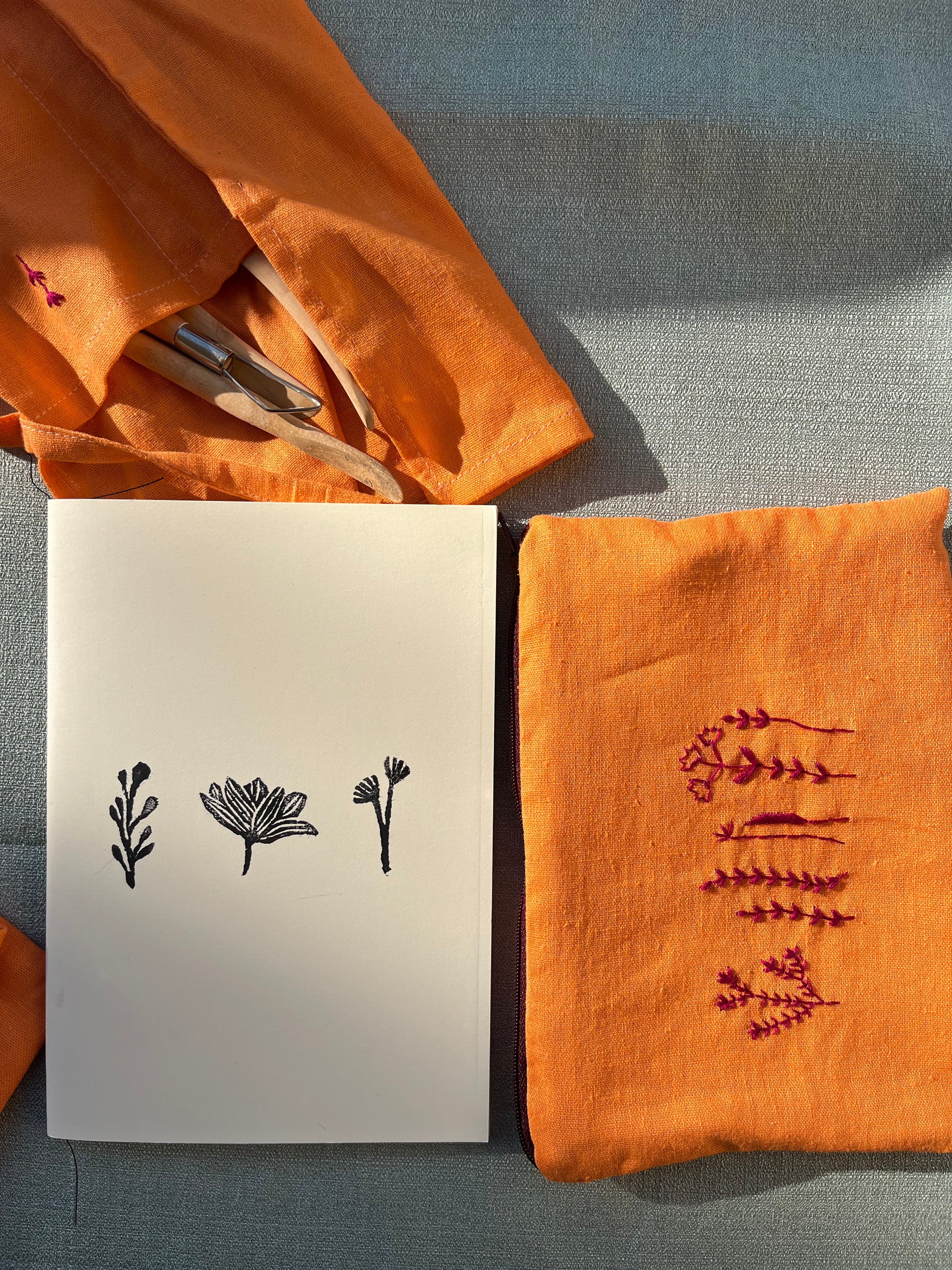 - An A5 sketchbook/plain notebook printed with hand-carved stamps
